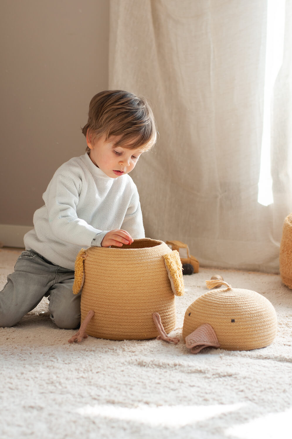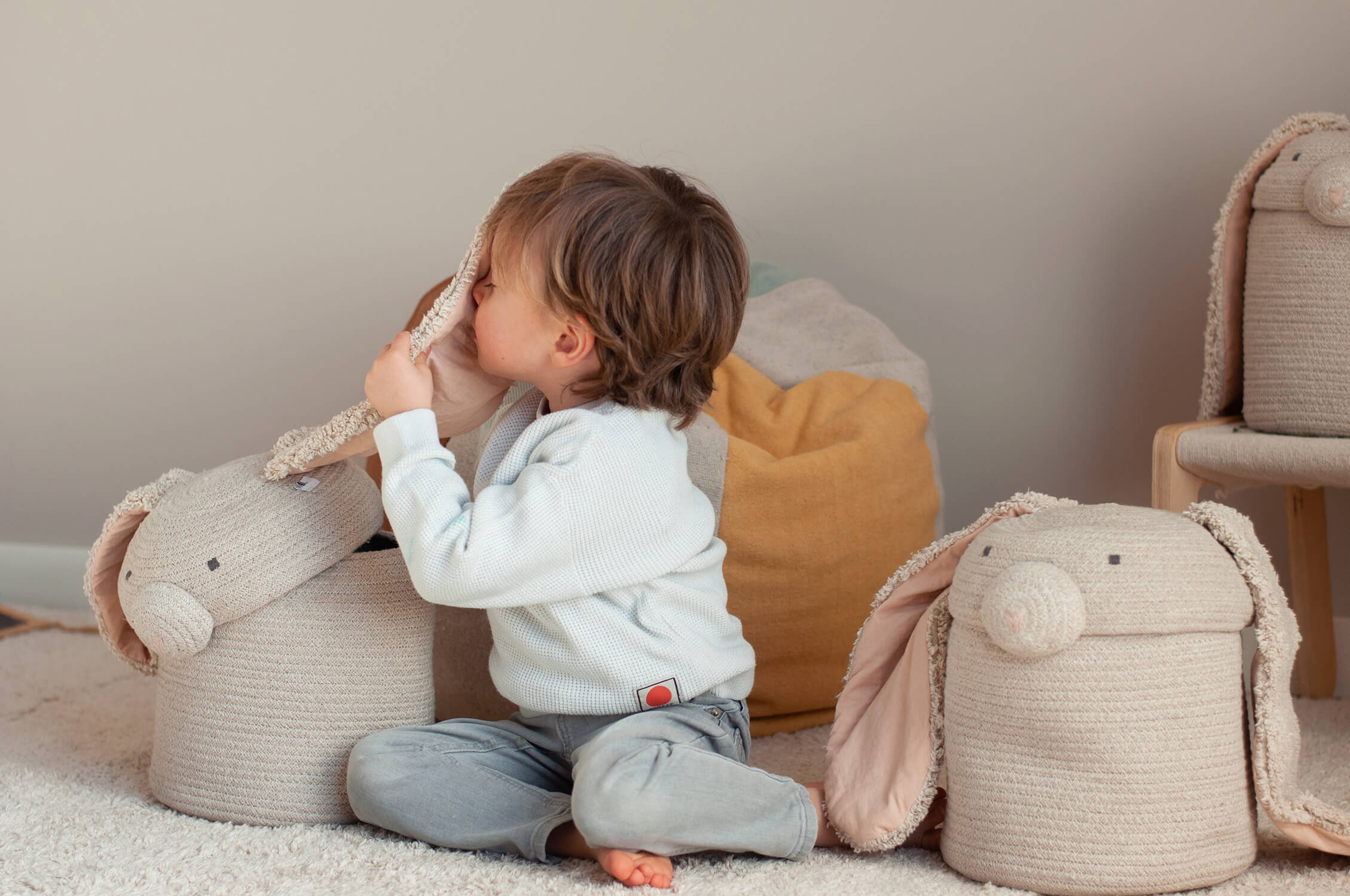 Košík Rabbi oválného tvaru je v neutrální, přírodní barvě. Na roztomilosti mu přidávají měkké všívané uši, kulatý nos a velká bavlněná bambule jako ocásek.