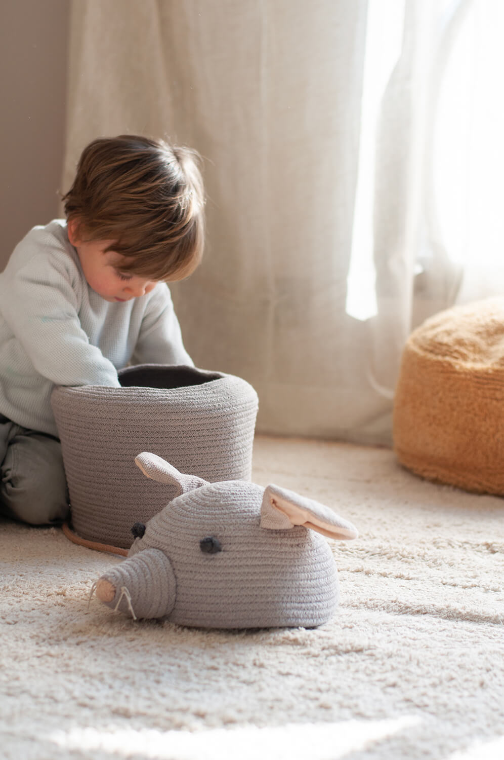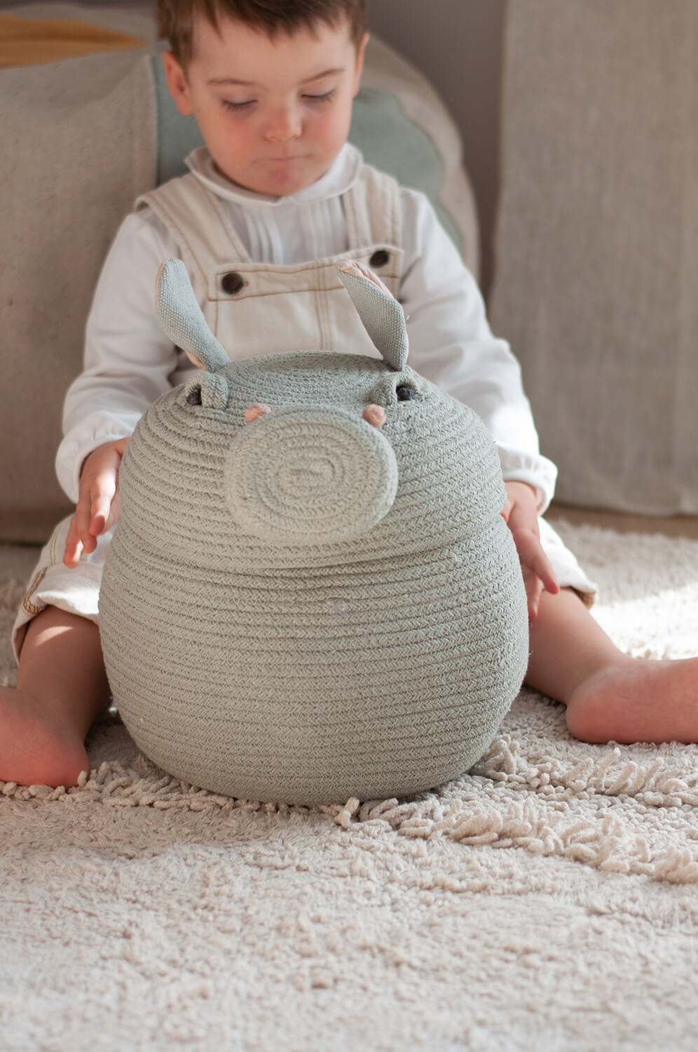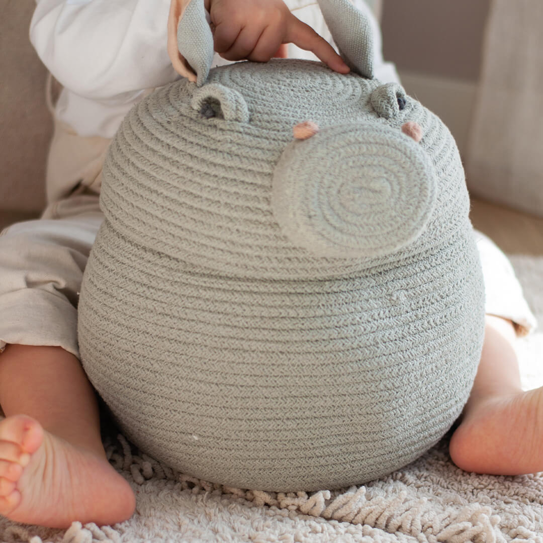 Šťastný jako hroch! S mírně kulatým víkem bude košík Hippi skvělým společníkem pro vaše děti! Je pečlivě ručně vyrobený a navíc má velký kulatý nos s nozdrami v růžové barvě a skládané plátěné uši.