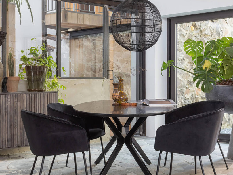 Stůl TELEH, ideální pro terasy, verandy nebo zahrady, se stává epicentrem venkovních setkání a podporuje blízkost a pohodlí při každém setkání.