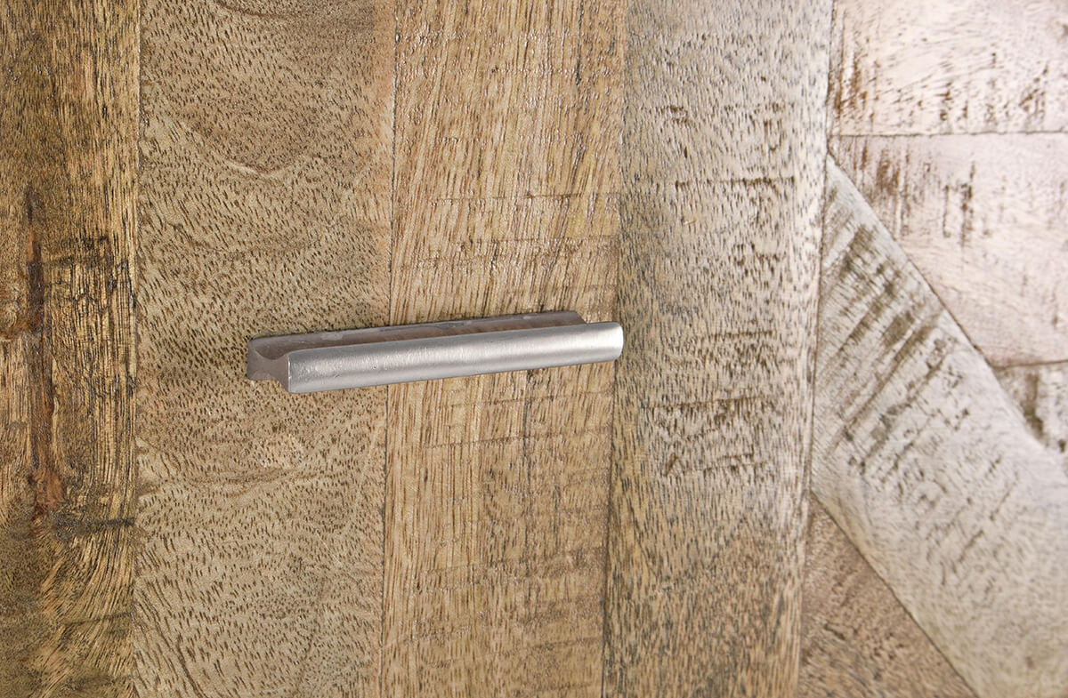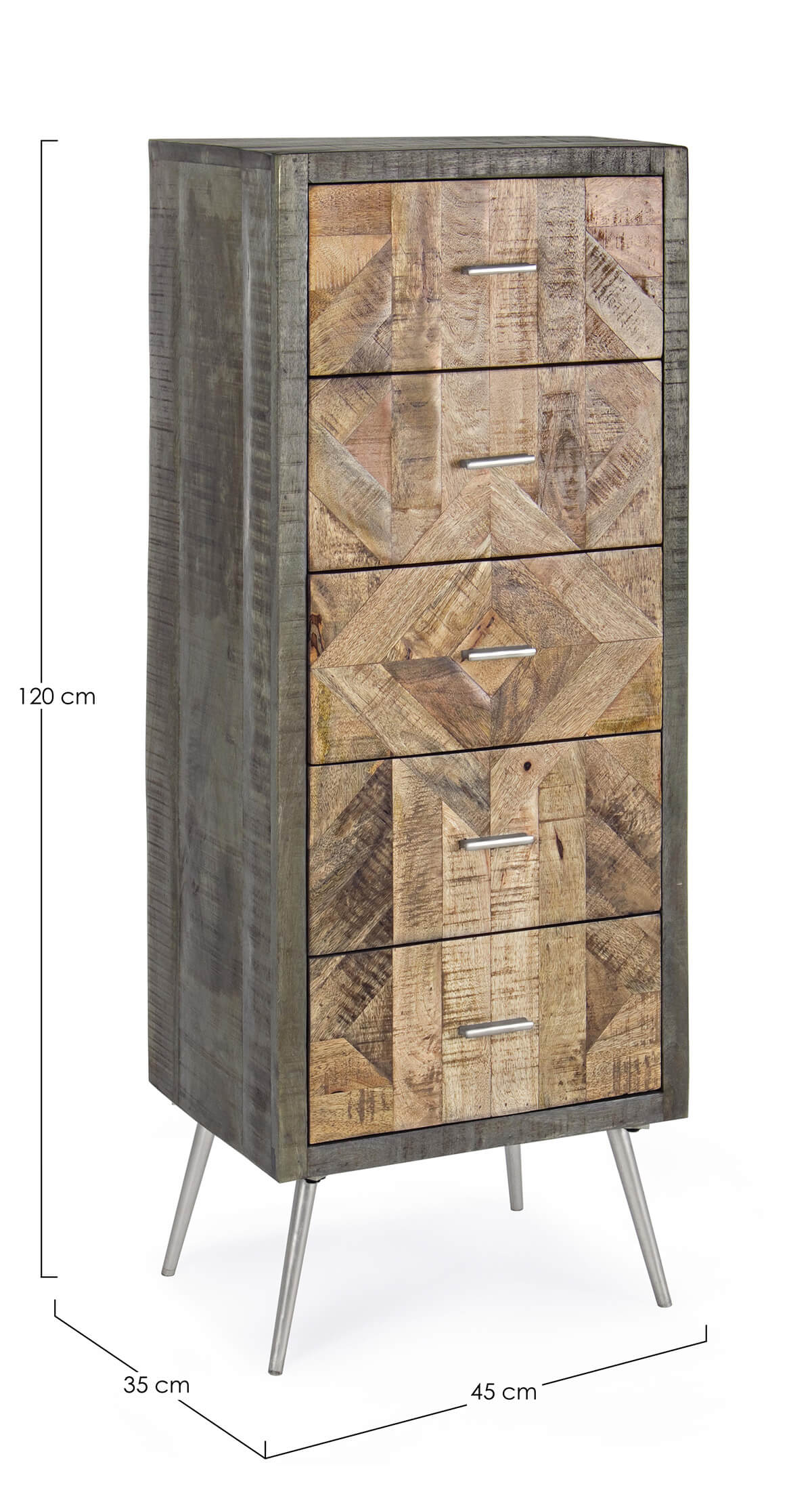 Komoda norwood vyrobena z mangového dřeva, vnitřní zásuvky z drevovláknité desky. Norwood má ocelové nohy a rukojeť.