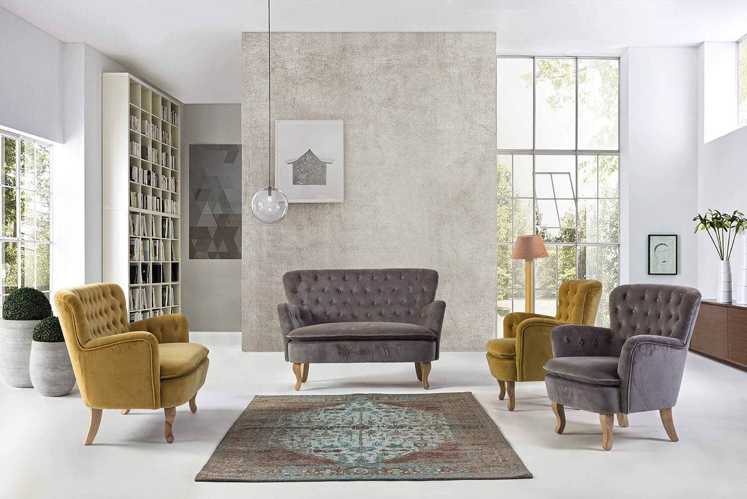 Úchvatné křeslo Orlins s potahem z prošívané bavlny se sametovým efektem a rámem z borového dřeva.
