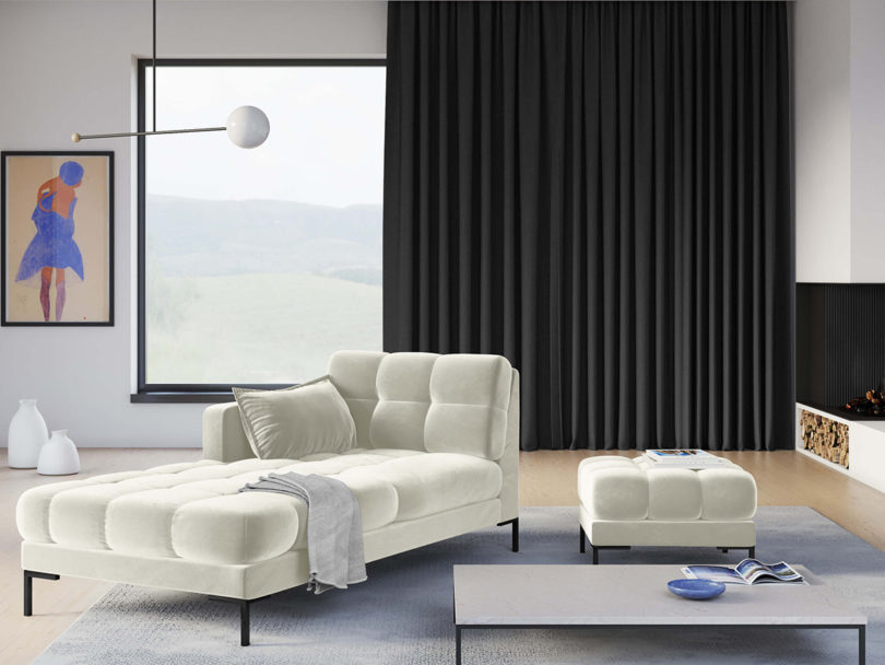 Tato lenoška je moderní a elegantní. Lenoška má jedinečný design a je vyrobena z krásné sametové látky. Díky štíhlému rámu nenápadně vyčnívá v obývacím pokoji. Nohy jsou vyrobeny z černého kovu.