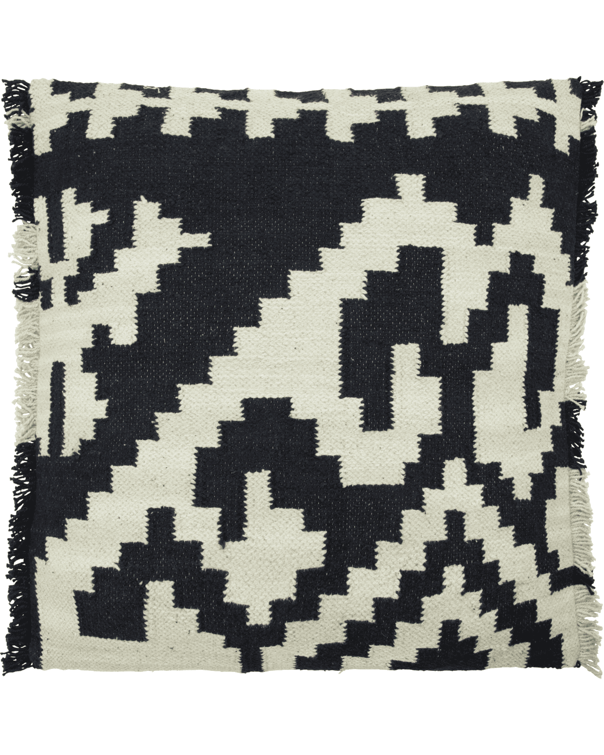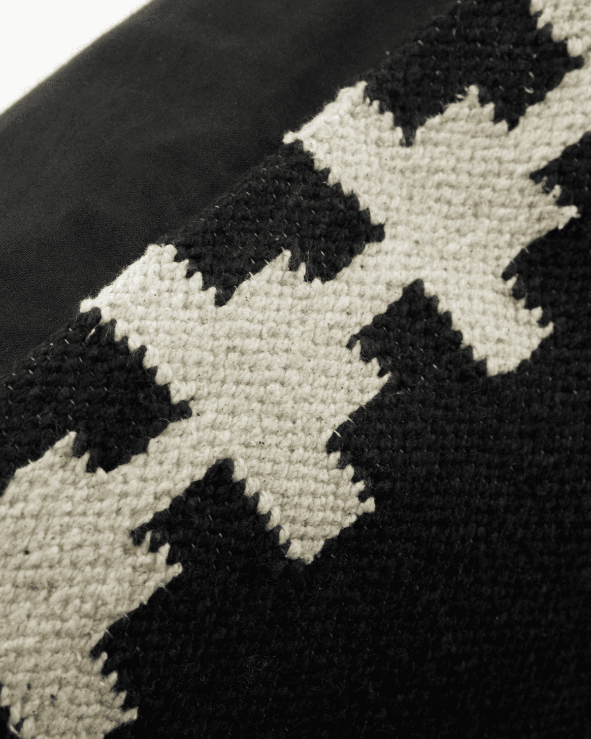 Povlak na polštář Luwo je ručně vyrobený z pevné bavlny a zdobený výrazným černo-pískovým grafickým vzorem, který dodá vašemu interiéru moderní a odvážný nádech. Stylové třásně a praktické zapínání na zip podtrhují jeho řemeslné zpracování, díky čemuž se stane nepřehlédnutelným doplňkem vašeho domova.
