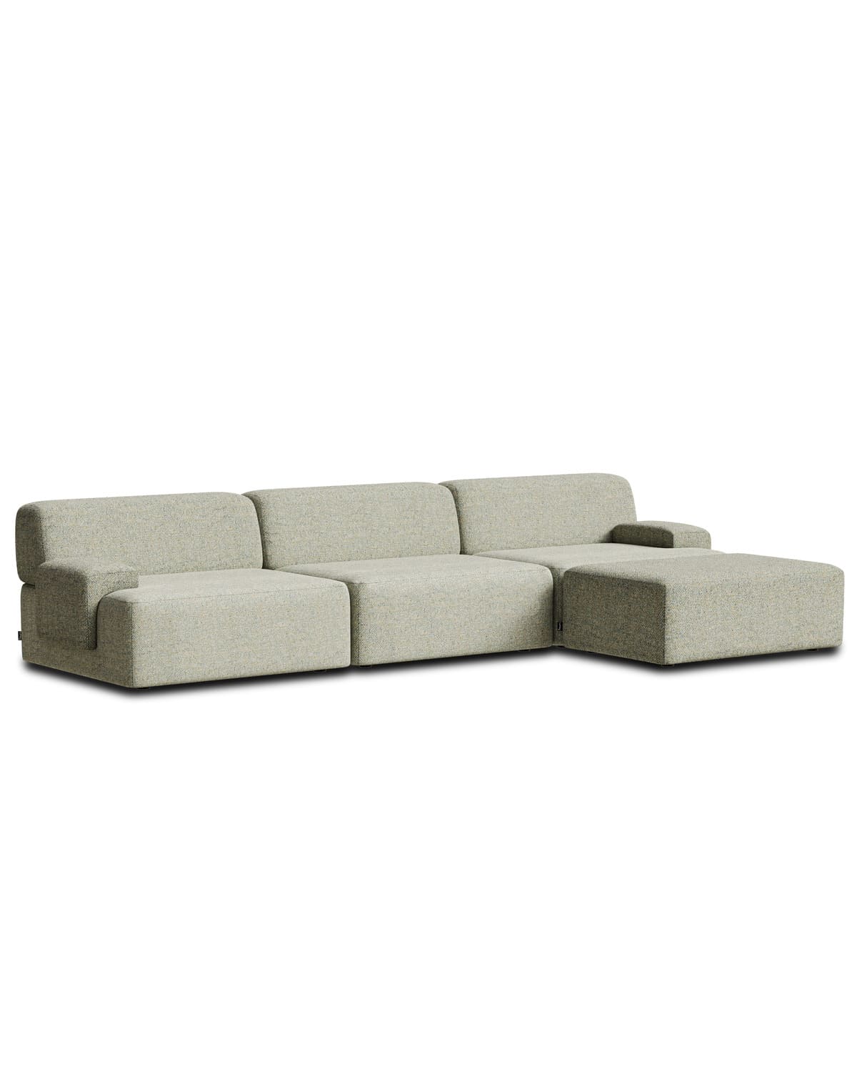 Tato sestava se skládá z trojmístné pohovky a samostatného pufu, který lze podle potřeby připojit z levé nebo pravé strany a vytvořit tak pohodlné rohové sezení. Puf můžete ale také nechat volně v prostoru – jako podnožku nebo extra místo k sezení. Roh si tak určujete sami podle dispozice svého interiéru.