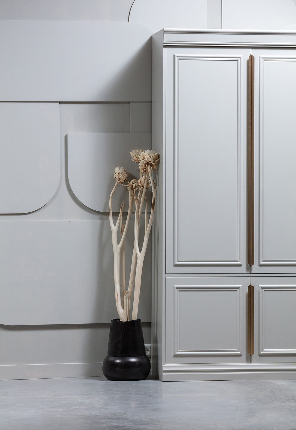 Krásná, robustní skříň s klasickými prvky, to je skříň Organize. Skříň Organize je vyrobena z pevného borovicového dřeva s certifikátem FSC, malovaná v moderní šedo-bílé barvě a má broušený povrch. Dveře mají krásné detaily a kovovou rukojeť po celé délce dveří ve starožitném mosazném provedení. Tato starožitná mosazná rukojeť přináší moderní provedení převážně klasické skříně. Interiér skříně je standardně opatřen závěsnou částí a 1 polici po celé šířce skříně. Ve spodní části skříně za dvěma menšími dveřmi je po celé šířce skříně také 1 široký regál. Produkt je vyroben z masivního dřeva pro které jsou rýhy a další drobné nedokonalosti na jeho povrchu přirozené, nikoliv chybné. Produkt není vyroben z dřevotřísky, u které je naopak hladký povrch bez nedokonalostí typický.