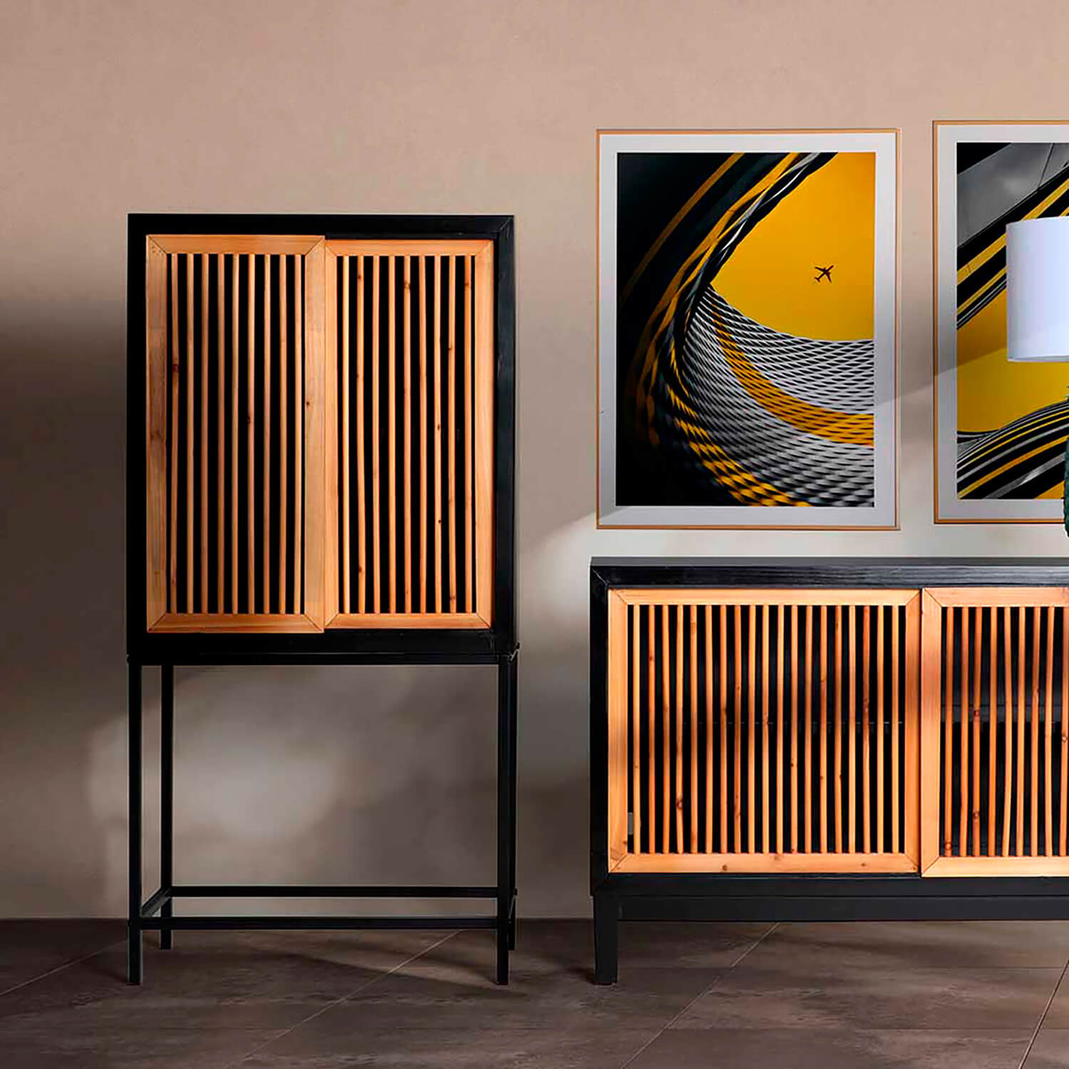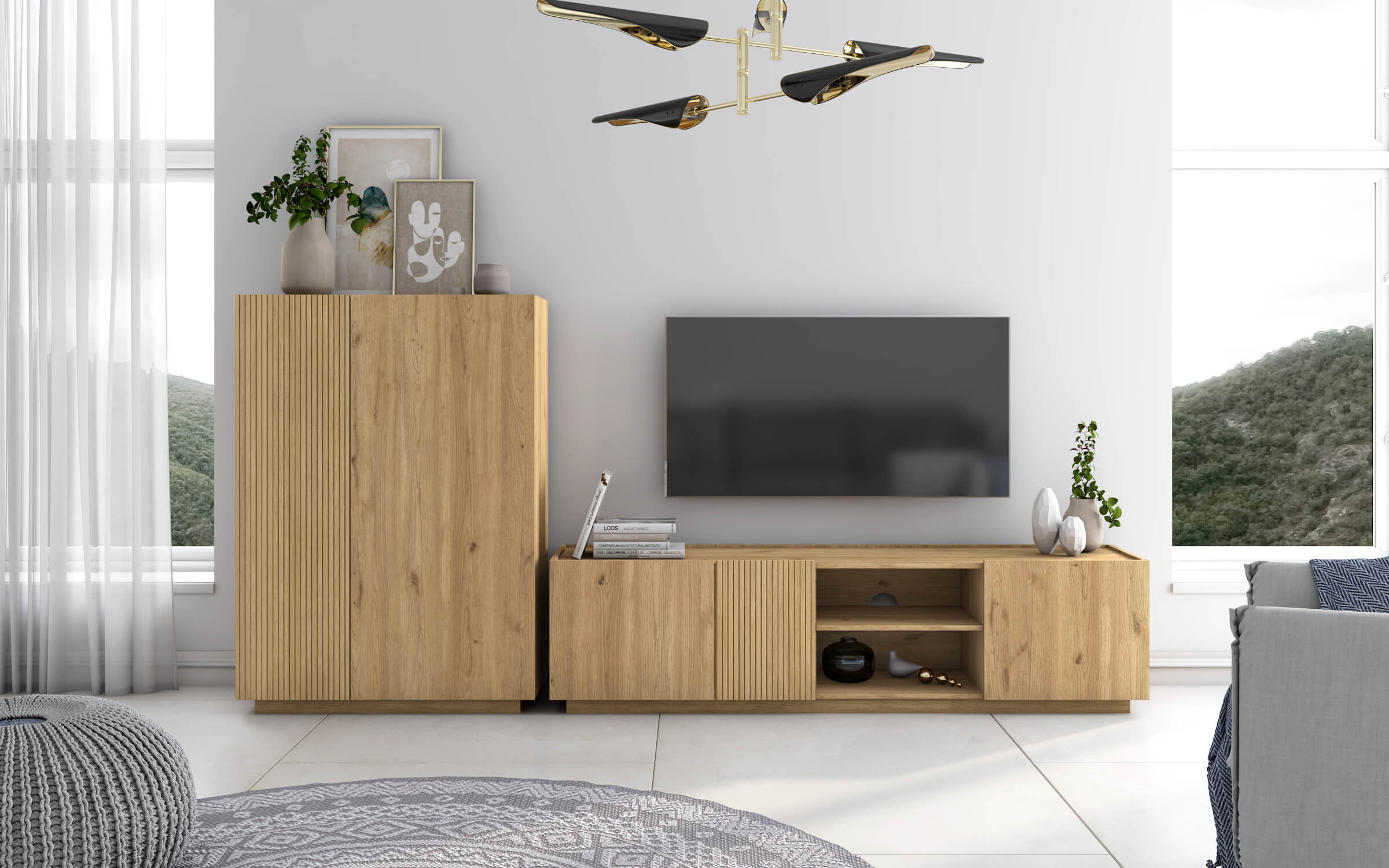 Interiér televizní skříňky je vyroben z dřevotřísky, zatímco vnější části jsou z borovicového dřeva. Borovice v naší kolekci je FSC certifikovaná a zpracovaná různými způsoby. Broušená borovice má hladký a čistý povrch, zatímco kartáčovaná borovice se vyznačuje rustikálním vzhledem. Pro robustnější efekt jsou některé části dřeva řezány na pásy, čímž získávají výraznější strukturu.
