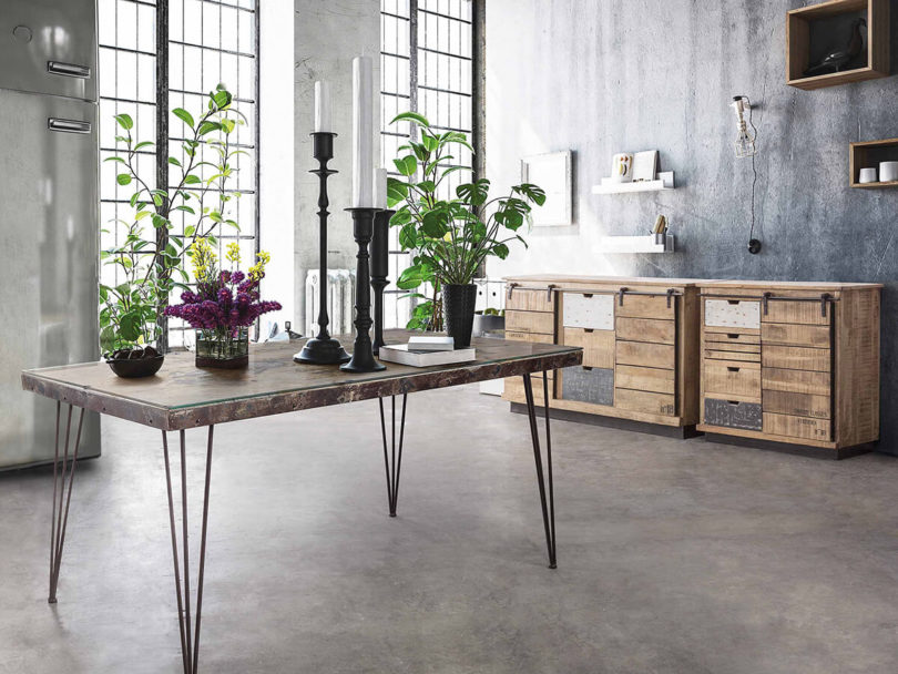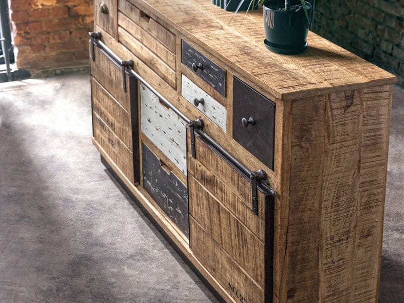TV skřínka Tudor je vyrobena z mangového dřeva s ocelovou základnou a zcela jistě zaujme svou originalitou.