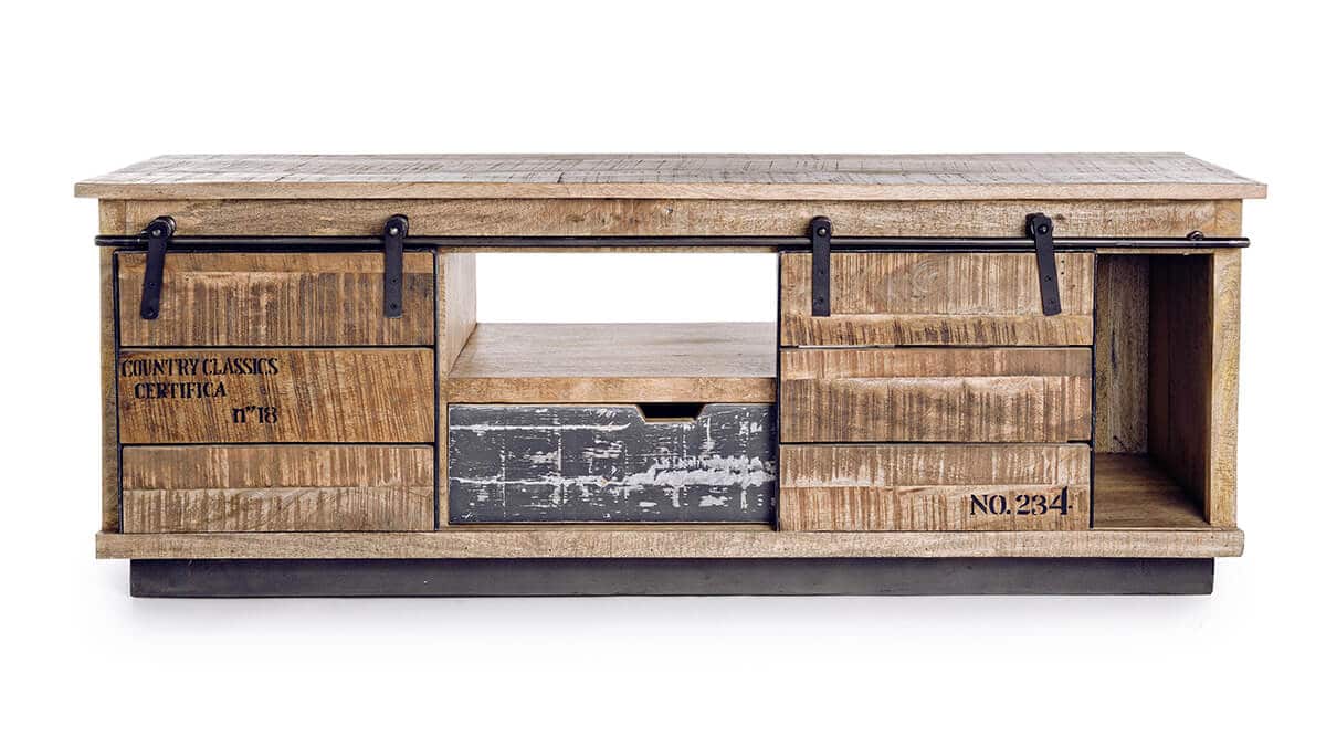 TV skřínka Tudor je vyrobena z mangového dřeva s ocelovou základnou a zcela jistě zaujme svou originalitou.