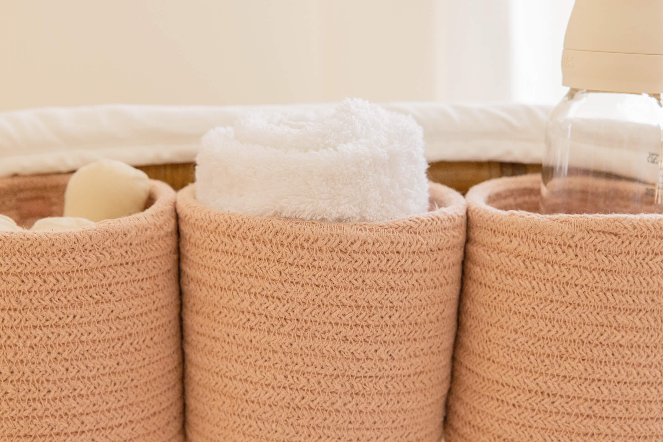 Závěsný úložný prostor na postýlku sestávající ze tří mini košíčků sešitých dohromady, vyrobený z pletených šňůr z recyklovaných PET vláken uvnitř a potažených bavlnou. Košík je navržen tak, aby se dal připevnit na vnější stranu postýlky. Svým tvarem je ideální na uložení lahviček, kousátek a oblíbených chrastících hraček vašeho miminka. Snadné připevnění k postýlce pomocí měkkých bavlněných šňůrek.