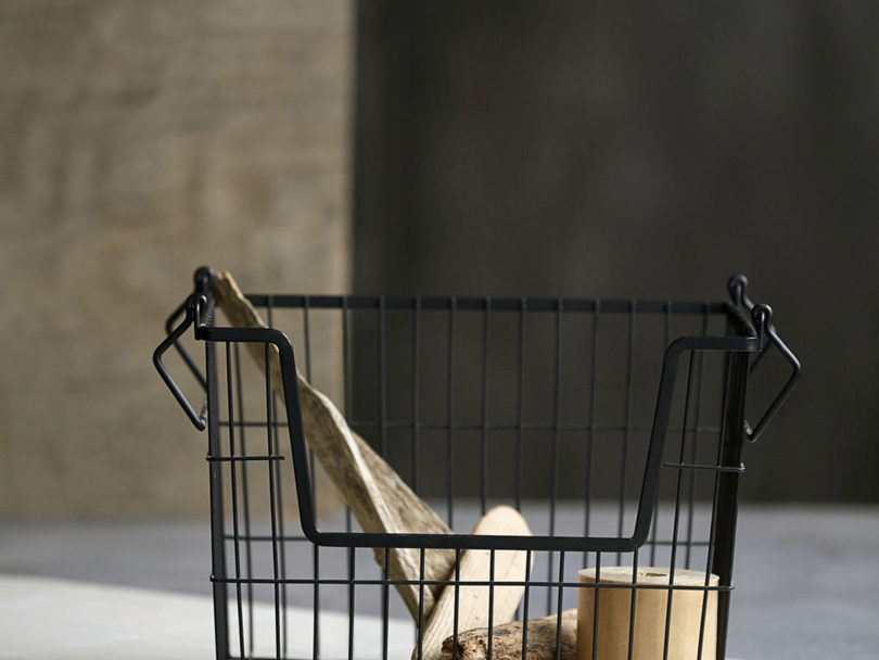 Košík ve tvaru houby složený ze dvou samostatných kusů. Spodní koš je dole silný a nahoře úzký, vyrobený z přírodní a smíšené lněné bavlněné šňůry s kontrastními stehy v hnědé barvě. Horní košík z přírodní bavlněné šňůry s vnitřním skládaným okrajem.
