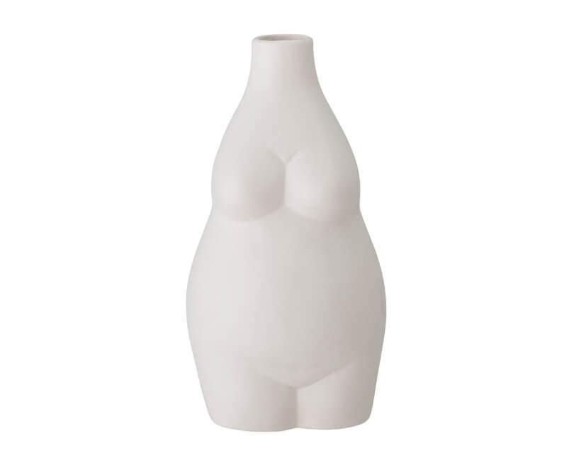 Jednoduchá bílá váza s křivkami ženského těla. Elegantní oslava a uznání ženského těla s jeho jemným tvarem a detaily. Dost krásná na to, aby byla sama o sobě ozdobou, ale přesto dostatečně diskrétní na to, aby byla vázou, která perfektně orámuje vaše květiny nebo rostliny. Tato malá dáma je vyrobena z kameniny pro elegantní a jednoduchý vzhled.