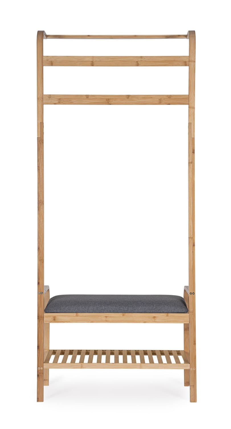 Věšák Lipp přírodní má strukturu z bambusu s povrchovou úpravou nitrocelulózovým lakem, což zajišťuje jeho odolnost a přirozený vzhled. Součástí je polstrovaný polyesterový polštář, vyplněný polyuretanovou pěnou o hustotě 17 kg/m3, což přidává na pohodlí. Produkt je dodáván v demontovaném stavu a je nutné ho sestavit. Vhodný pro moderní interiéry, kde zajišťuje praktickou organizaci.